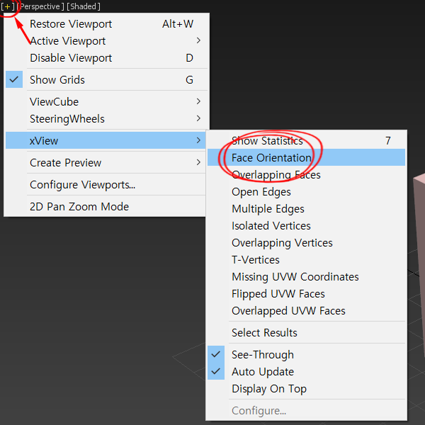 3)뷰포트의 좌측 상단에서 xview의 face orientation를 체크합니다.