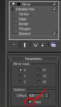 4)Mirror의 Parameters에서 대칭 축(Mirror Axis)을 선택하고 Options에서 copy에 체크합니다.