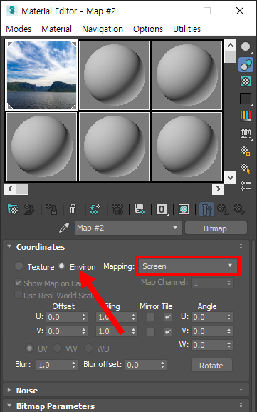 5)비트맵의 coordinates에서 environment에 체크하고 맵핑 방법으로 screen을 선택합니다.