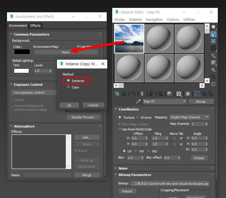3)비트맵을 environment and effects의 environment map에 복사합니다(instance)