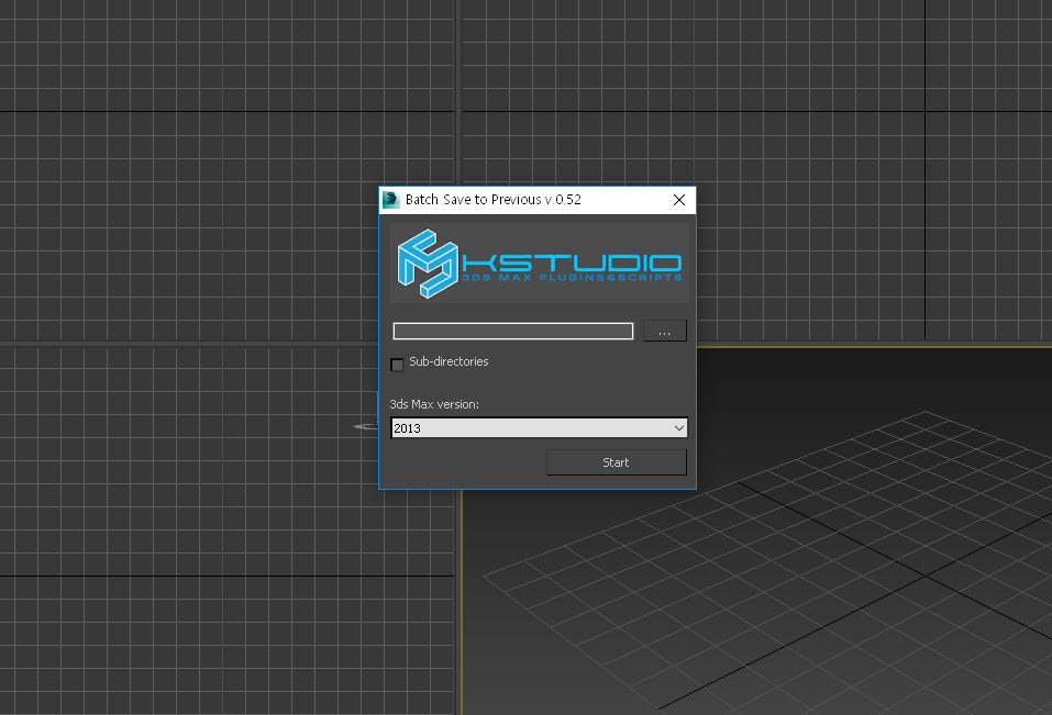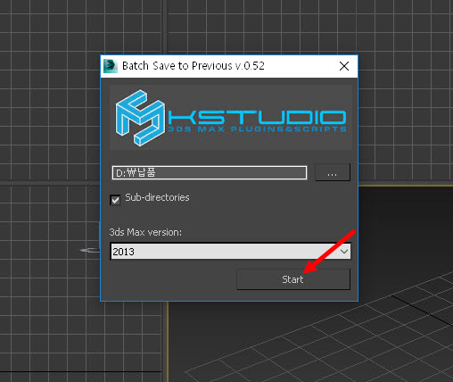 2)맥스 파일이 위치한 폴더를 설정하고 저장할 맥스 버전을 선택한후에 start를 클릭합니다. 예에서 현재 맥스파일은 2014버전이며 새로 저장할 버전으로 2013를 선택하였습니다.
