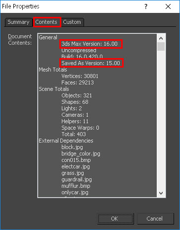5)file properties의 contents탭에서 현재 열기한 맥스파일의 버전을 확인할수있습니다.