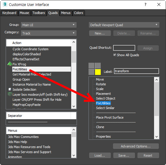 3)customize user interface의 quards 탭에서 track 카테고리를 선택하면 스크립트 목록을 표시합니다. fixutilities를 클릭, 아래 표시한곳에 드래그하여 쿼드 메뉴에 추가합니다.