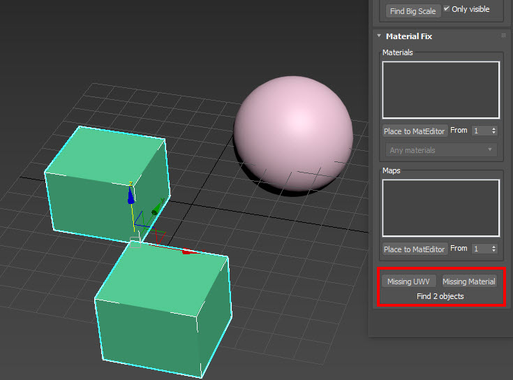 7)추가적으로 하단의 missing UVW, missing Material를 클릭하면 UV 또는 재질이 없는 오브젝트를 선택할수있습니다.