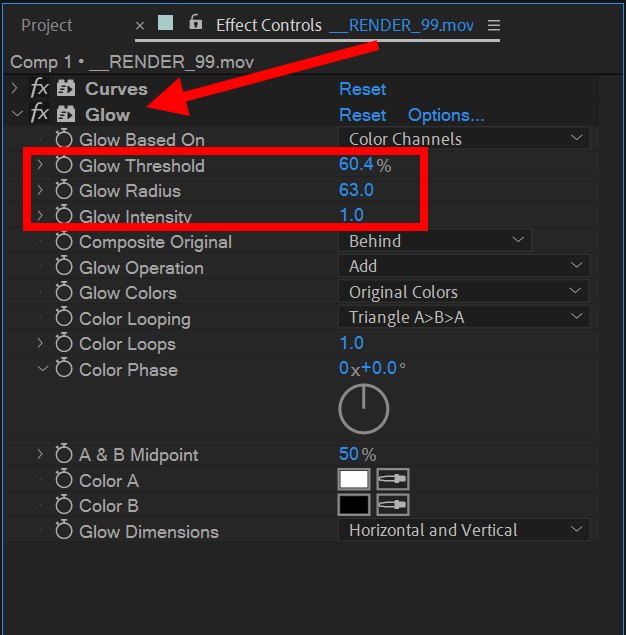 6)glow 이펙트를 추가하고 속성을 설정합니다.