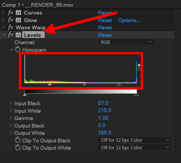 9)levels 이펙트를 추가하고 히스토그램을 수정합니다.
