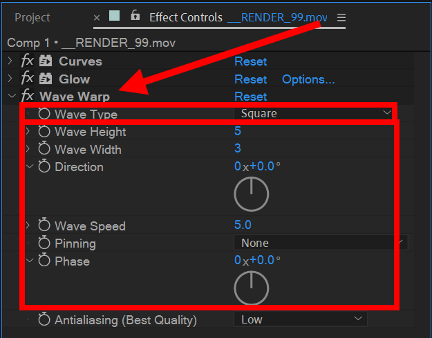 8)wave warp 이펙트를 추가하고 속성을 설정합니다.