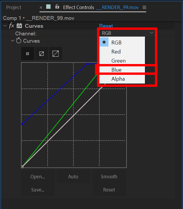 4)blue(파랑) 채널을 선택하고 커브를 아래와 같이 수정합니다.