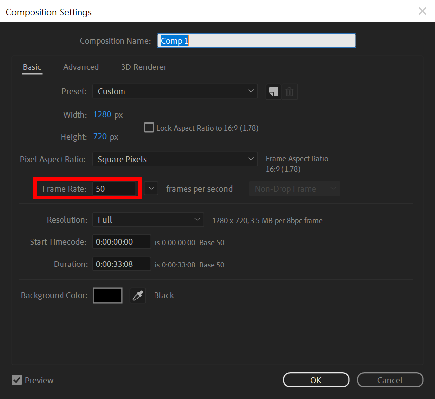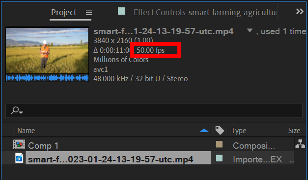1)프로젝트에 동영상을 가져오기합니다. 동영상의 fps와 동일한 프레임레이트(frame rate)의 컴포지션을 생성합니다.