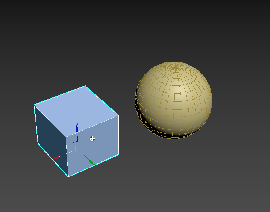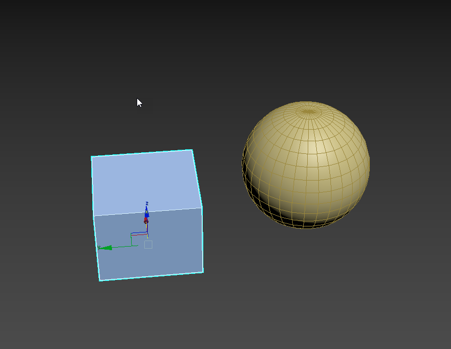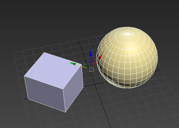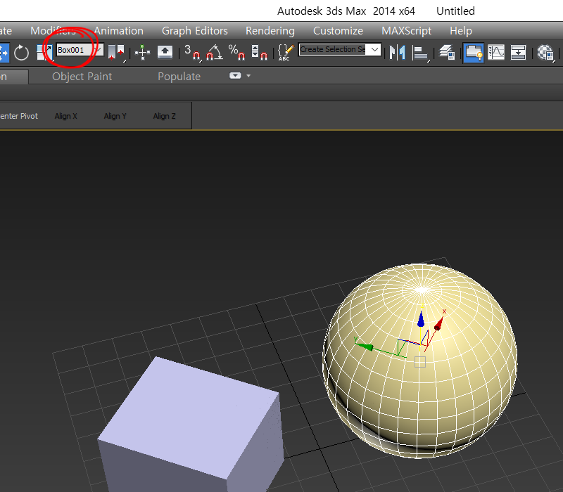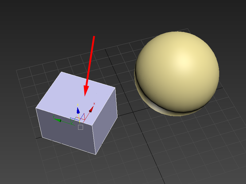 4)스피어 오브젝트를 선택하고 reference coordinate에서 box001를 선택합니다. 스피어 오브젝트를 선택하면 박스 오브젝트의 로컬축을 표시합니다.