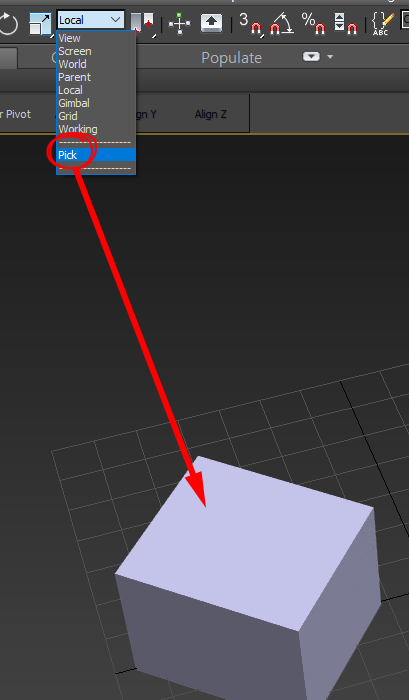 2)박스 오브젝트를 reference coordinate system에 추가하면 다른 오브젝트가 이 오브젝트의 로컬축을 사용할수있습니다. 트랜스폼 툴(move, rotate, scale)을 선택하고 coordinate system에서 pick를 선택한후 박스 오브젝트를 선택합니다.
