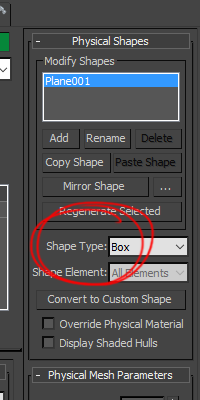 6)Physical Shapes에서 shape type으로 box를 선택합니다. plane 오브젝트의 리지드바디를 물리적으로 박스 형태로 설정합니다.