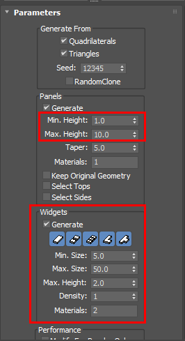4)건물의 최소, 최대 높이(min, max. height)와 건물의 상부 형태를 설정합니다(widgets)