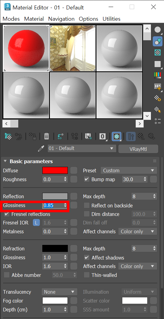 5)glossiness의 수치를 입력하여 재질의 광택을 표현합니다.