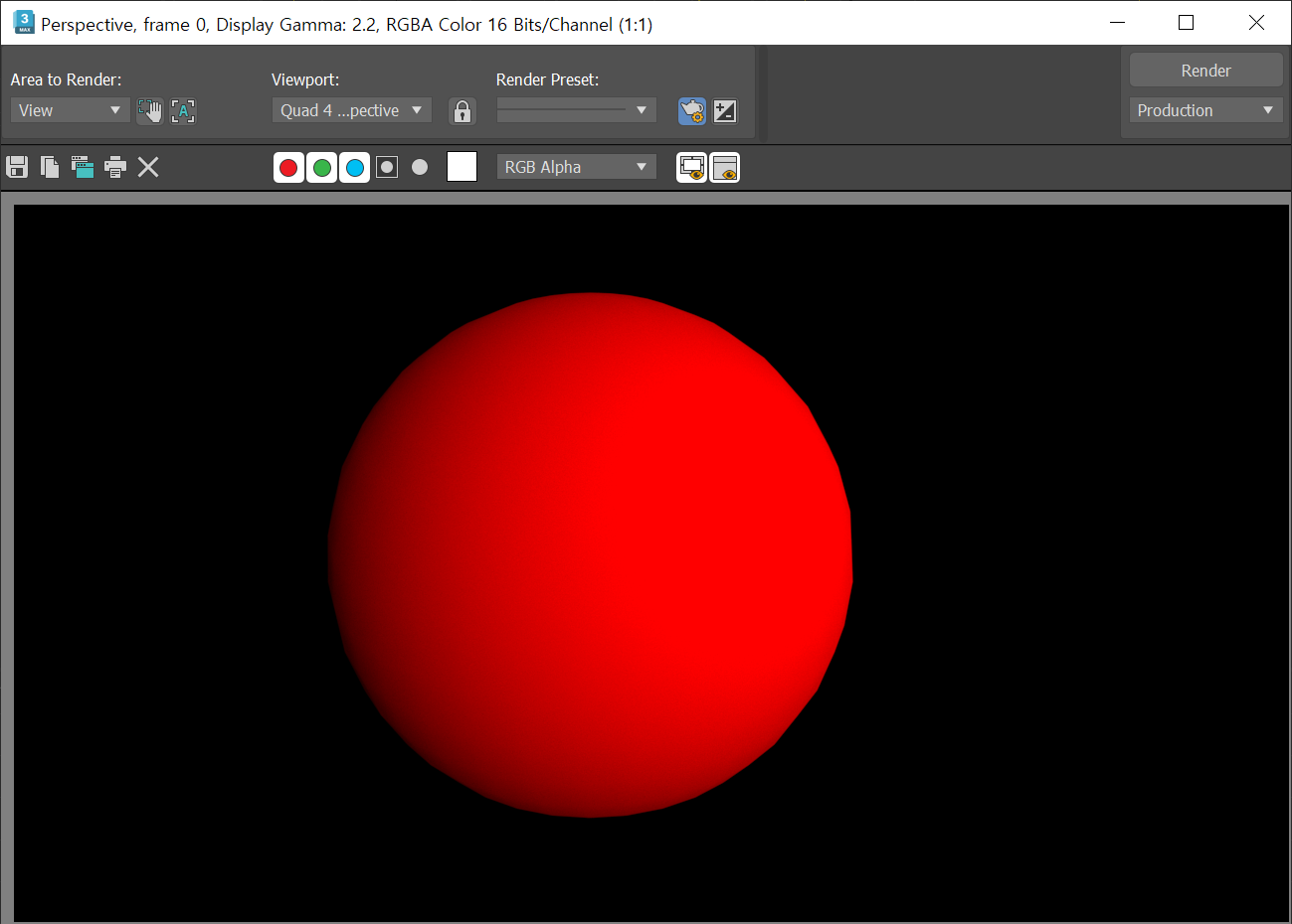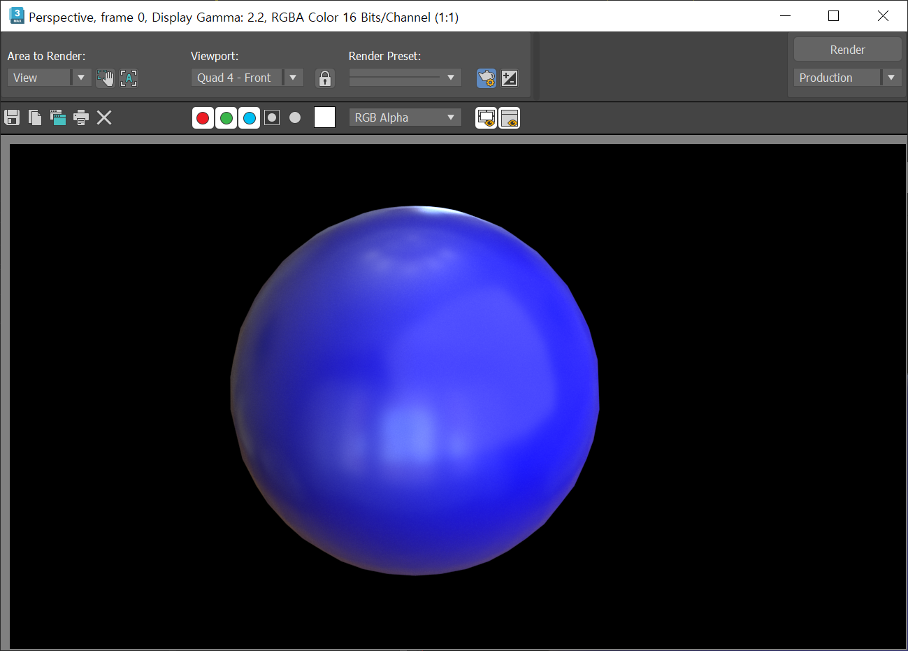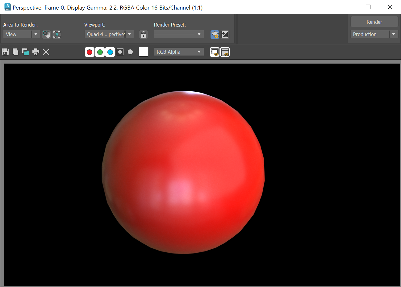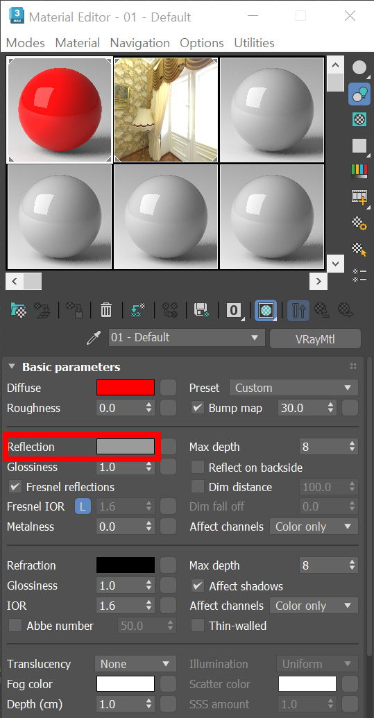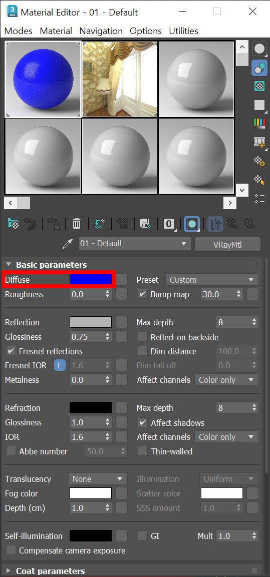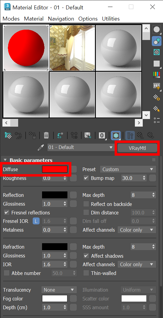 2)sphere 오브젝트에 새로운 VRayMtl 재질을 할당합니다. 플라스틱의 색상을 설정합니다.