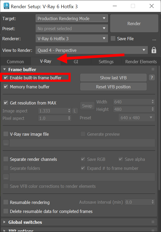 3D맥스 브이레이(v-ray)에서 브이레이 프레임 버퍼(v-ray frame buffer) 활성화하기