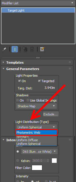 6)조명의 light distribution에서 photometric web을 선택합니다.
