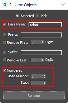 5)base name에 변경할 오브젝트의 기본 이름을 입력하고 numbered에 체크한후 rename을 클릭하면 선택한 모든 오브젝트의 이름을 변경하고 이름 뒤에 숫자를 기입합니다.