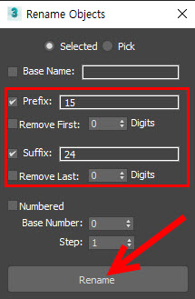 3)prefix와 suffix에 기존의 오브젝트 이름 앞뒤에 기입할 문자를 입력하고 rename을 클릭합니다.