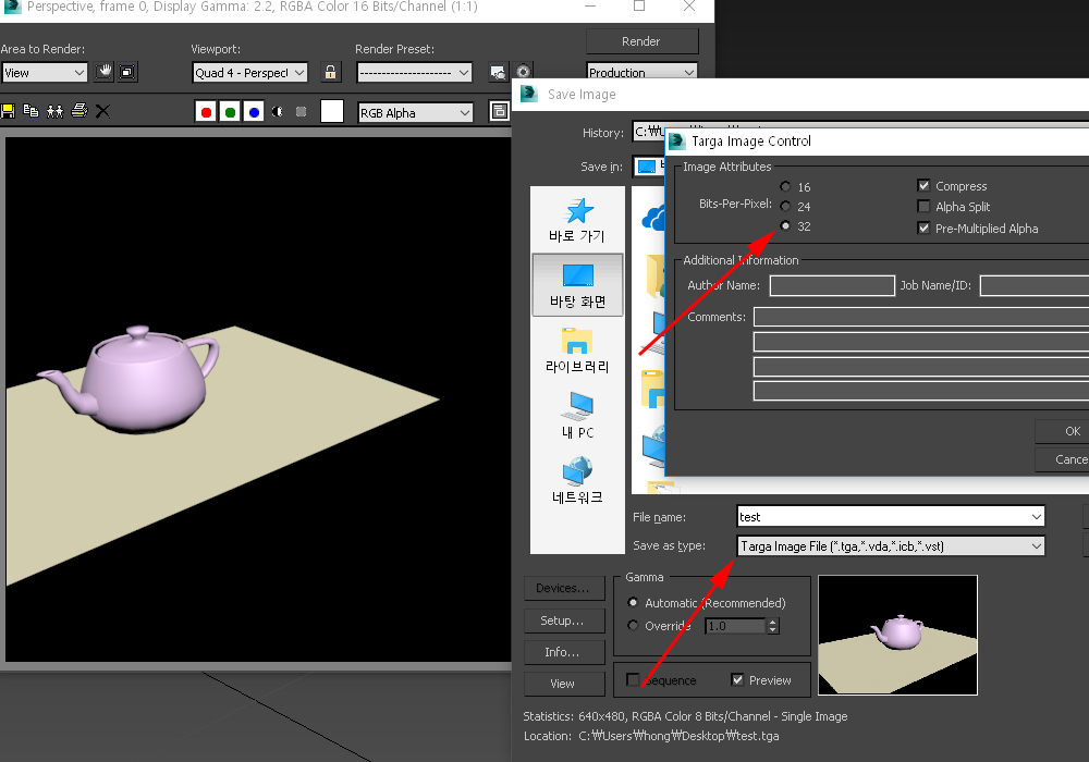 1)렌더링한 이미지 저장에서 Targa Image FIle(TGA) 형식을 선택하고 옵션에서 32비트(bits-per-pixel)에 체크한후 확인합니다.