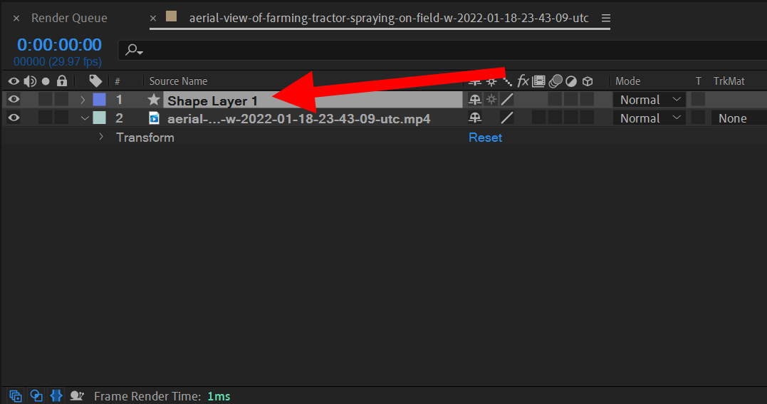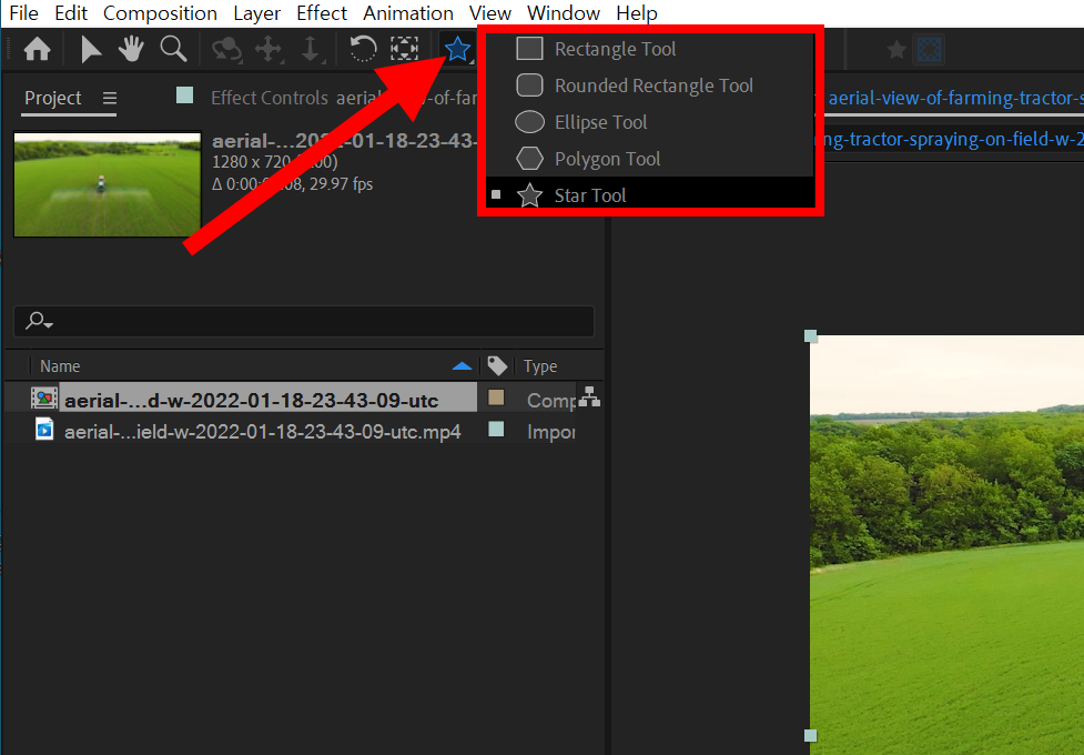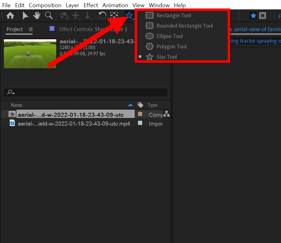 2)컴포지션에서 마스킹 영역을 추가할 레이어를 선택하고 상단의 모양 도구를 선택합니다.