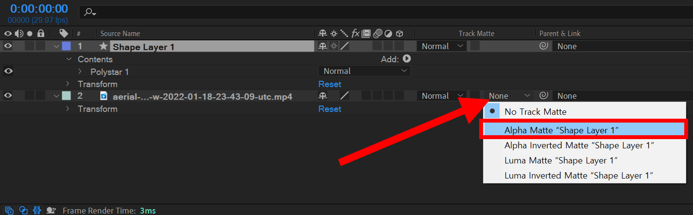 7)마스킹 영역을 설정할 레이어를 선택하고 track matte에서 alpha matte shape layer를 선택합니다.
