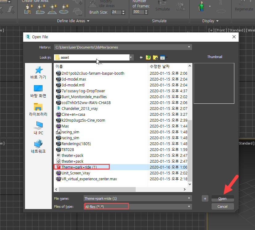 1)3D 맥스에서 스케치업 파일을(skp 확장자) 열기하려면 open file에서 all files type으로 선택하고 해당 파일을 열기합니다.