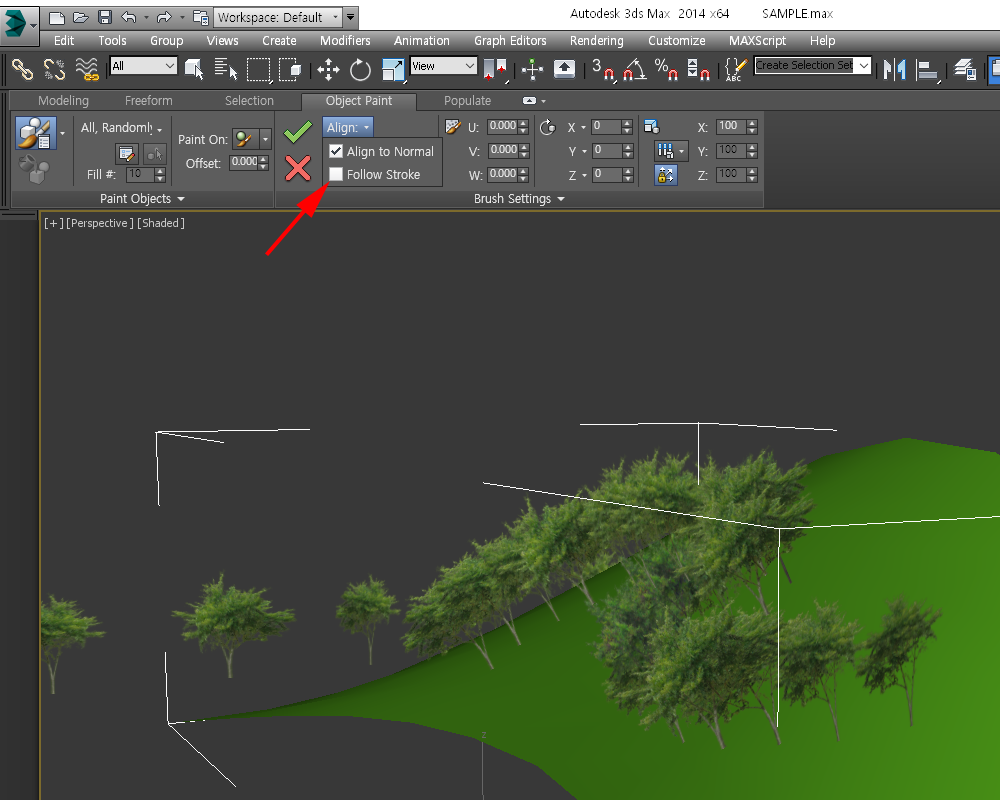 11)follow stroke를 체크해제하고 페인트를 진행하면 stroke의 방향과 상관없이 오브젝트를 배치합니다.