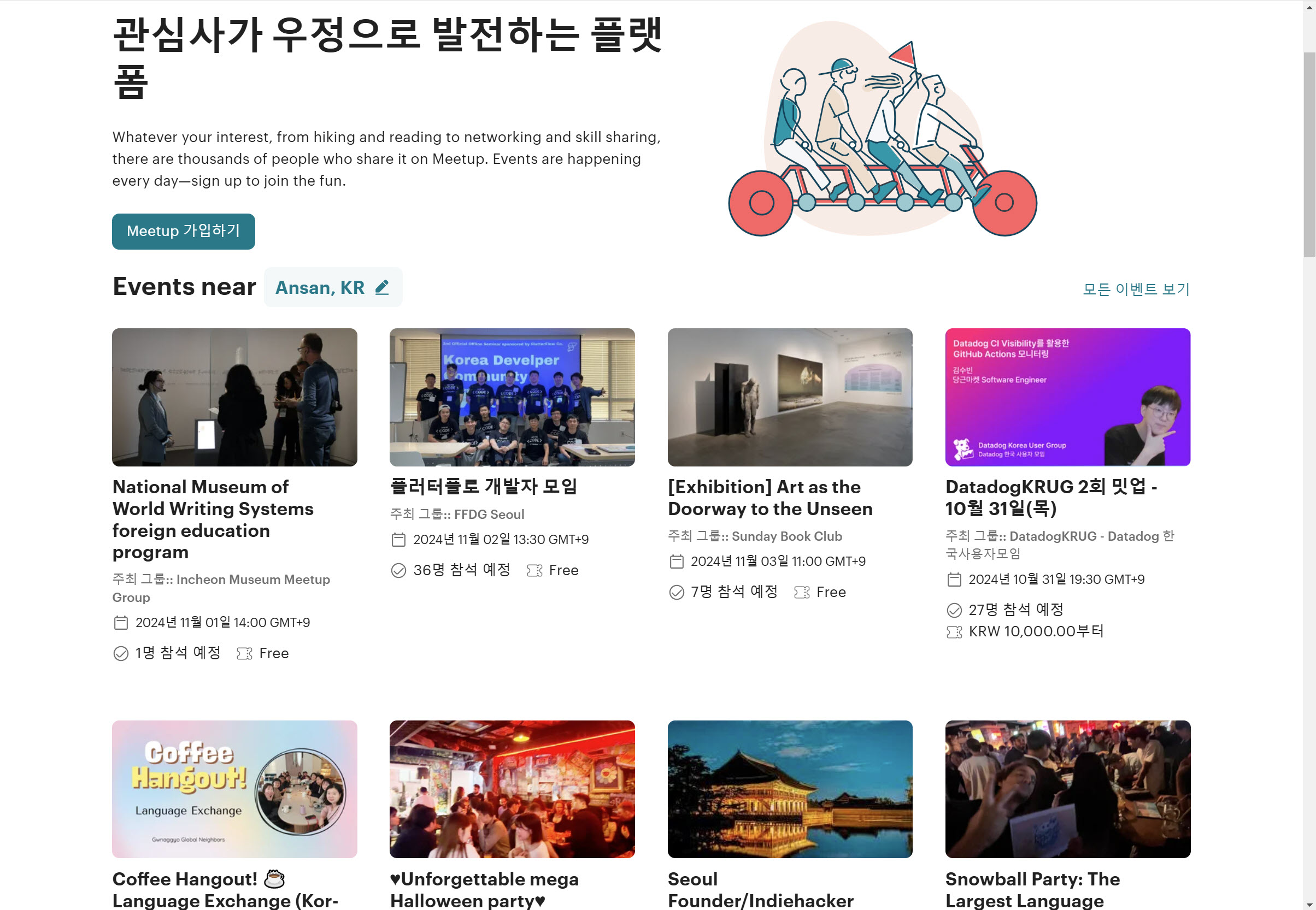 특정 주제나 관심사를 가진 사람들이 모여 오프라인에서 만나는 이벤트를 조직하고 참여할 수 있는 플랫폼입니다. 네트워킹과 정보 공유에 유용합니다(하이킹, 독서, 기술 공유 등)