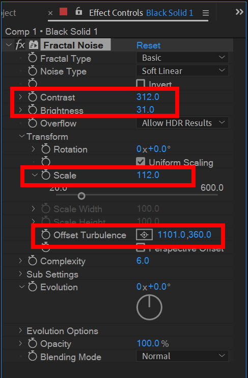 5)contrast, brightness 수치를 입력하여 노이즈의 대조를 높이고 scale, offset turbulence 수치를 입력하여 노이즈 크기와 형태를 설정합니다.