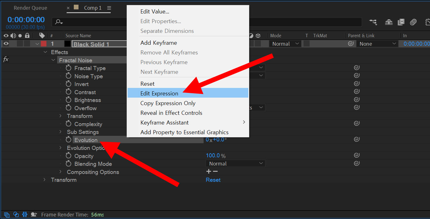 5)evolution 속성을 선택하고 마우스 우클릭한후 edit expression을 선택합니다.