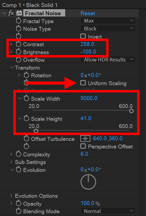 4)contrast, brightness 값을 입력하여 노이즈의 대조를 높이고 transform의 uniform scaling을 체크해제하고 스케일의 너비와 높이를 설정합니다(scale width, scale height)