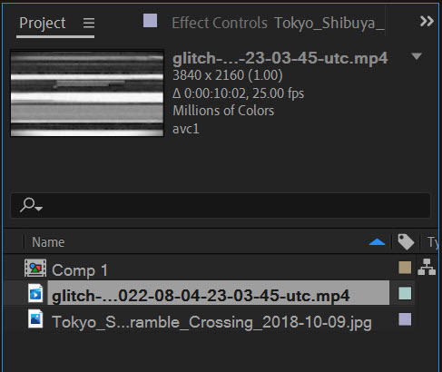 2)글리치(glitch) 동영상을 프로젝트로 가져오기합니다.