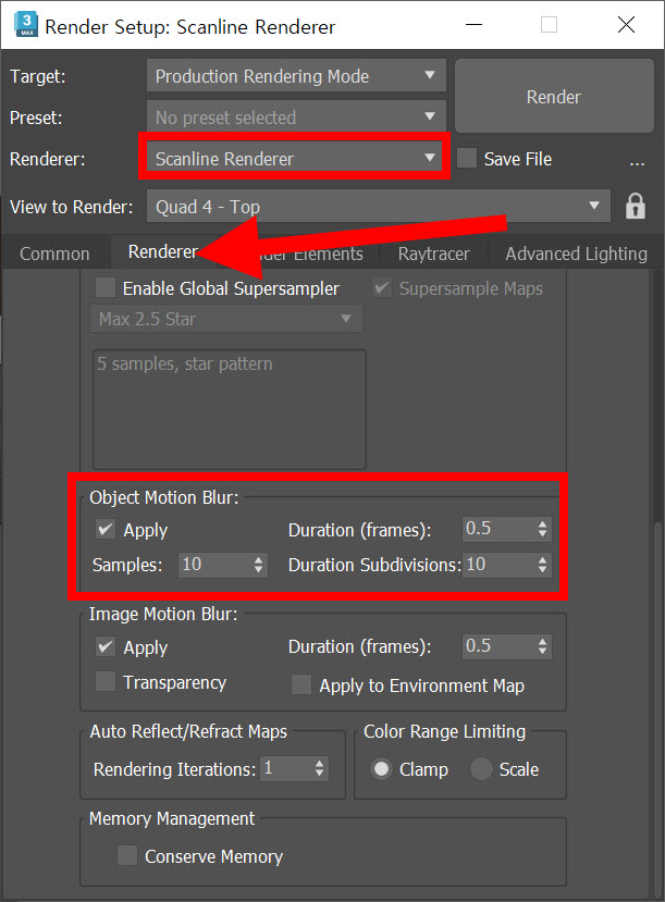 2)렌더 설정(render setup)으로 이동하여 스캔라인 렌더러의 renderer에서 object motion blur의 apply에 체크되어있는지 확인합니다.