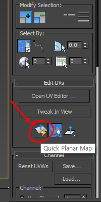 3)Unwrap UVW에서 폴리곤 선택을 활성화하고 Edit UVs에서 Display Quick Planar Map를 활성화합니다.