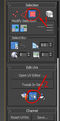 3)Unwrap UVW에서 폴리곤 선택을 활성화하고 Edit UVs에서 Display Quick Planar Map를 활성화합니다.