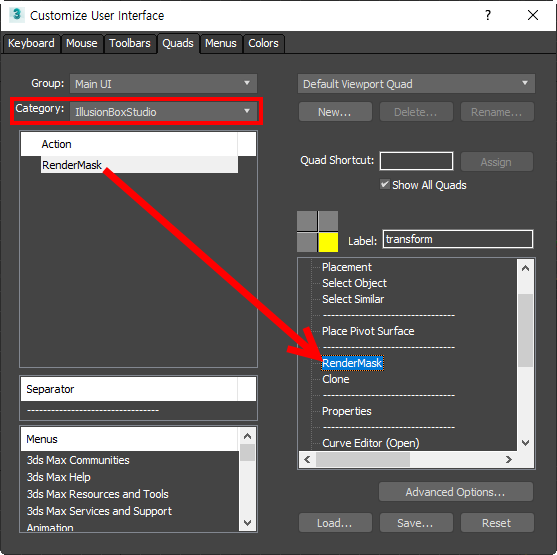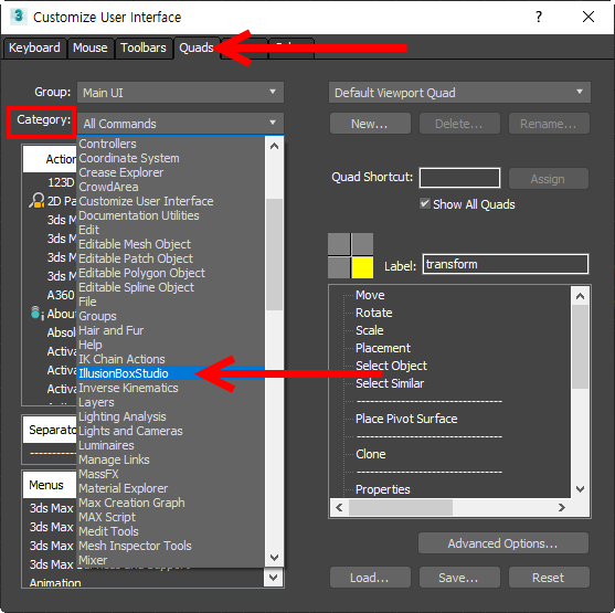 3)quads 탭을 선택하고 illusionBoxStudio 카테고리를 선택합니다.