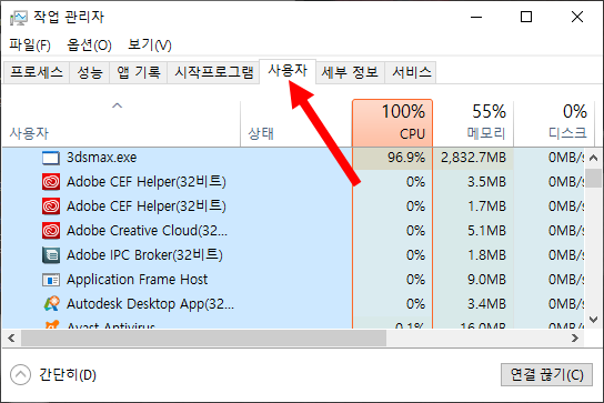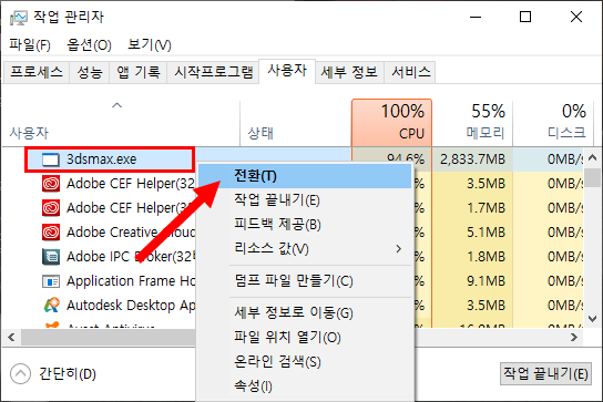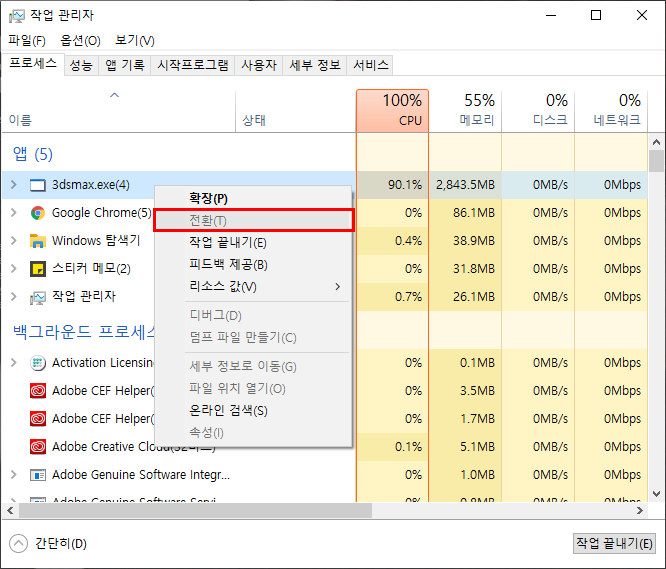 1)일반적으로 작업관리자에서 프로그램을 선택하고 앱 전환을 사용하면 해당 어플리케이션을 현재 작업중인 목록중 최상위에 표시합니다. 그런데 프로세스 탭의 앱 전환은 선택할수없게 되어있습니다.
