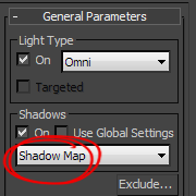 2)씬에 새로운 조명 오브젝트(omni light)를 추가하고 shadows의 on에 체크합니다.