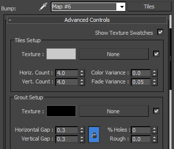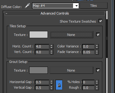 5)tiles setup에서 타일의 행, 열 개수(horiz, vert count), 색상 편차(color variance), 페이드 편차(fade varaince)를 설정합니다. Grout setup에서 타일 사이의 그라우트 수평 및 수직 크기를 설정하고(horizontal, vertical gap) 타일 표면의 hole(%holes), 그라우트 가장자리의 거친 정도(rough)를 설정합니다.