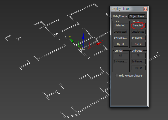 5)도면 오브젝트를 선택하고 freeze의 selected를 선택하면 선택한 오브젝트를 선택 불가능한 상태로 설정합니다.