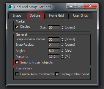 8)options 탭에서 snap to frozen objects에 체크하면 freeze 상태인 오브젝트에 snap을 사용할수있습니다.