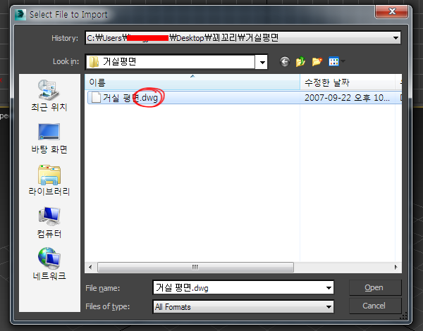 2)dwg는 2D 또는 3D 도면 정보를 저장하는데 사용되는 파일 형식입니다. 캐드에서 제작한 평면 도면(.dwg)을 선택하고 가져오기합니다.
