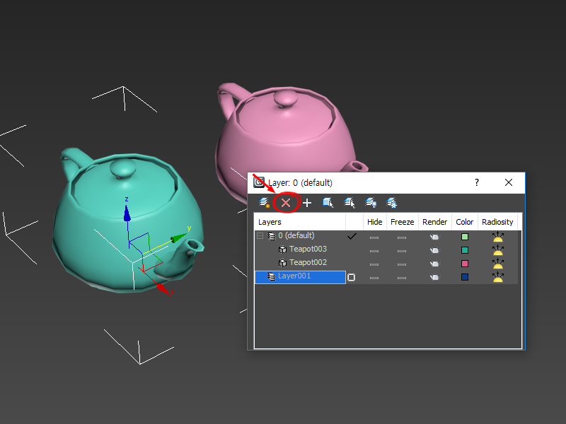 레이어(Layer001)를 선택하고 아래 표시한 버튼을 클릭해서 레이어를 제거합니다.