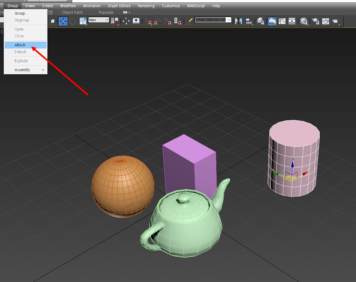 2)새로운 오브젝트를 그룹에 종속시키려면 오브젝트를 선택하고 group 메뉴의 attach를 선택하고 그룹을 선택합니다.