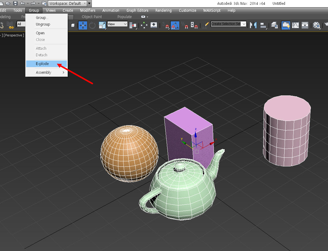 7)group의 explode를 선택하면 씬에서 선택한 모든 그룹(group) 오브젝트외 그룹의 하위 그룹 오브젝트를 그룹 해제하여 개별 오브젝트로 설정합니다(ungroup)