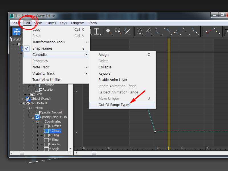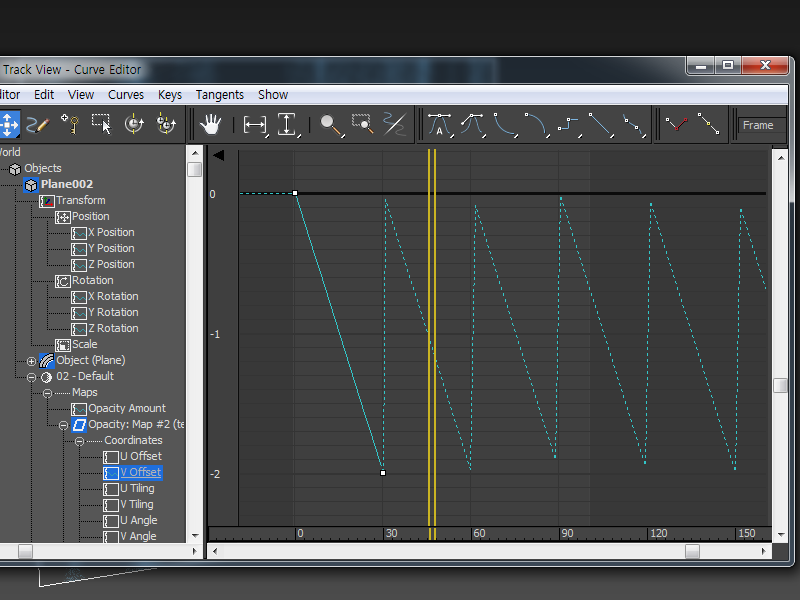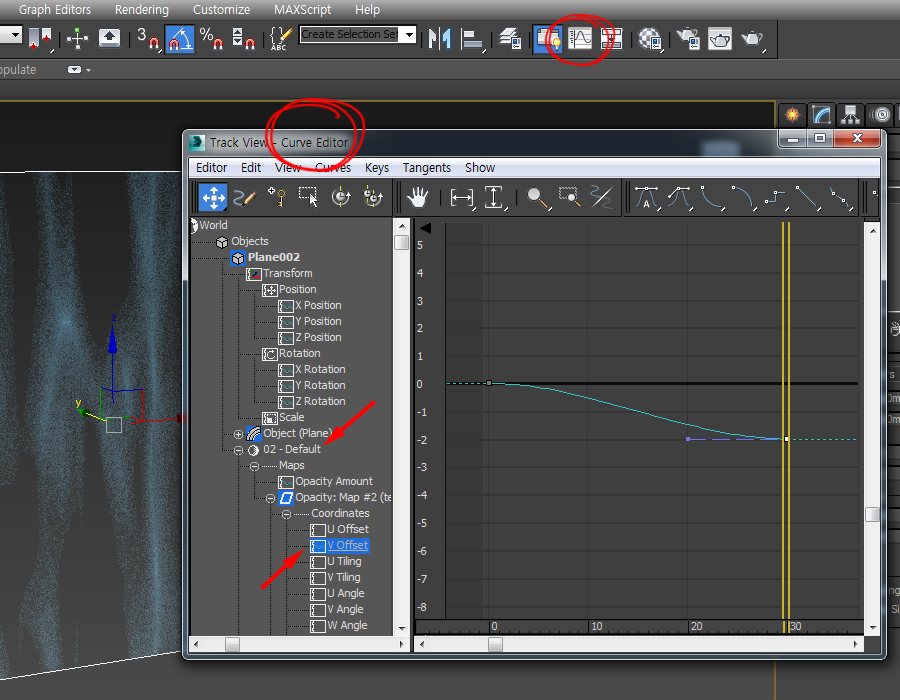 10)오브젝트를 선택하고 Track view - Curve Editor의 좌측에서 V Offset 속성을 선택하여 애니메이션 커브를 표시합니다.