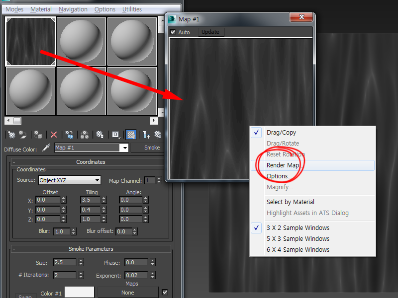 4)재질 편집기에서 맵의 재질 슬롯을 두번 클릭하고 미리보기에서 마우스 우클릭한후 render map를 선택합니다.