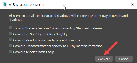 4)V-Ray scene converter에서 convert를 클릭하면 씬의 모든 재질을 브이레이 재질(VRayMtl)로 변경합니다.