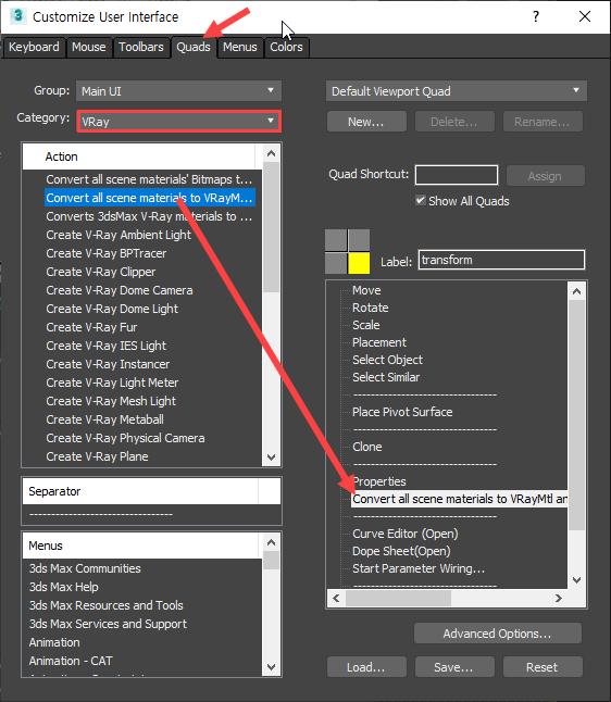 1)customize user interface의 quads 탭에서 VRay 카테고리를 선택하고 convert all scene materials to vraymtl를 클릭, 드래그하여 우측의 쿼드 메뉴에 추가합니다.